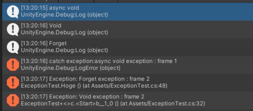 async void Awake() { try { Debug.Log("async void"); await UniTask.Delay(5); throw new Exception($"async void exception : frame {Time.frameCount}"); } catch (Exception e) { Debug.LogError("catch exception:" + e.Message); } } private void St…