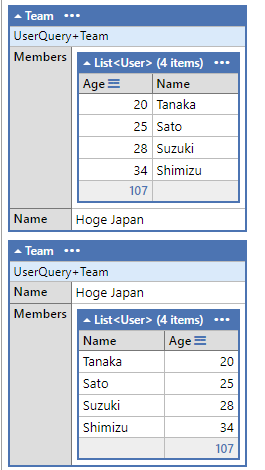 // exclude : 指定したメンバーを除外 team.Dump(exclude: "Members"); // include : 指定したメンバー以外を除外 team.Dump(include: "Name");