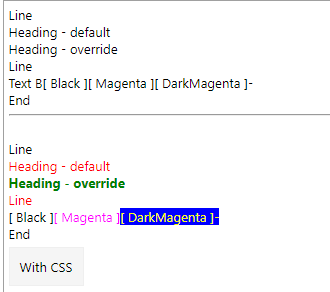 Util.WithHeading("hoge", "Head").Dump(); Util.WithStyle("fuga", "color: blue").Dump(); Util.WithStyle("fuga", "font-family:consolas").Dump(); Util.WithStyle("piyo", "font-size: 24px; color: red; background-color: black; display: block;").Dump(); var names1 = new string[] { "Taro", "Hanako", "Jiro" }; var names2 = new string[] { "Taro", "Hanako" }; Util.Dif(names1, names2).Dump("Differences"); Util.RawHtml("<hr/>").Dump(); Util.RawHtml("<h1>Hoge</h1>").Dump(); Util.RawHtml("<h2>Hoge</h2>").Dump(); Util.RawHtml("<h3>Hoge</h3>").Dump();
